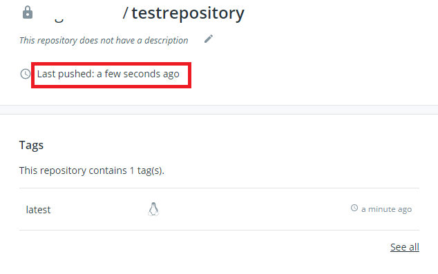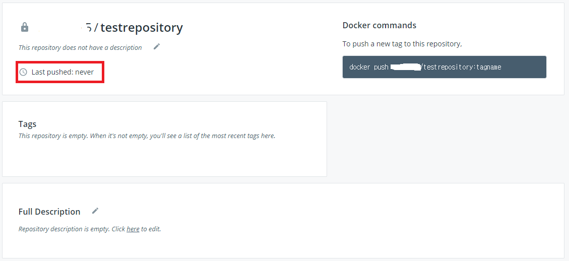 7. 아래와 같이 레퍼지토리가 생성되었으며 빨간색 네모박스에 가장 최근에 푸쉬된 내역이 없는 것을 확인할 수 있습니다.