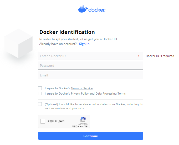 3. Docker ID와 비밀번호 그리고 이메일 계정을 입력하고 continue를 클릭합니다.